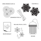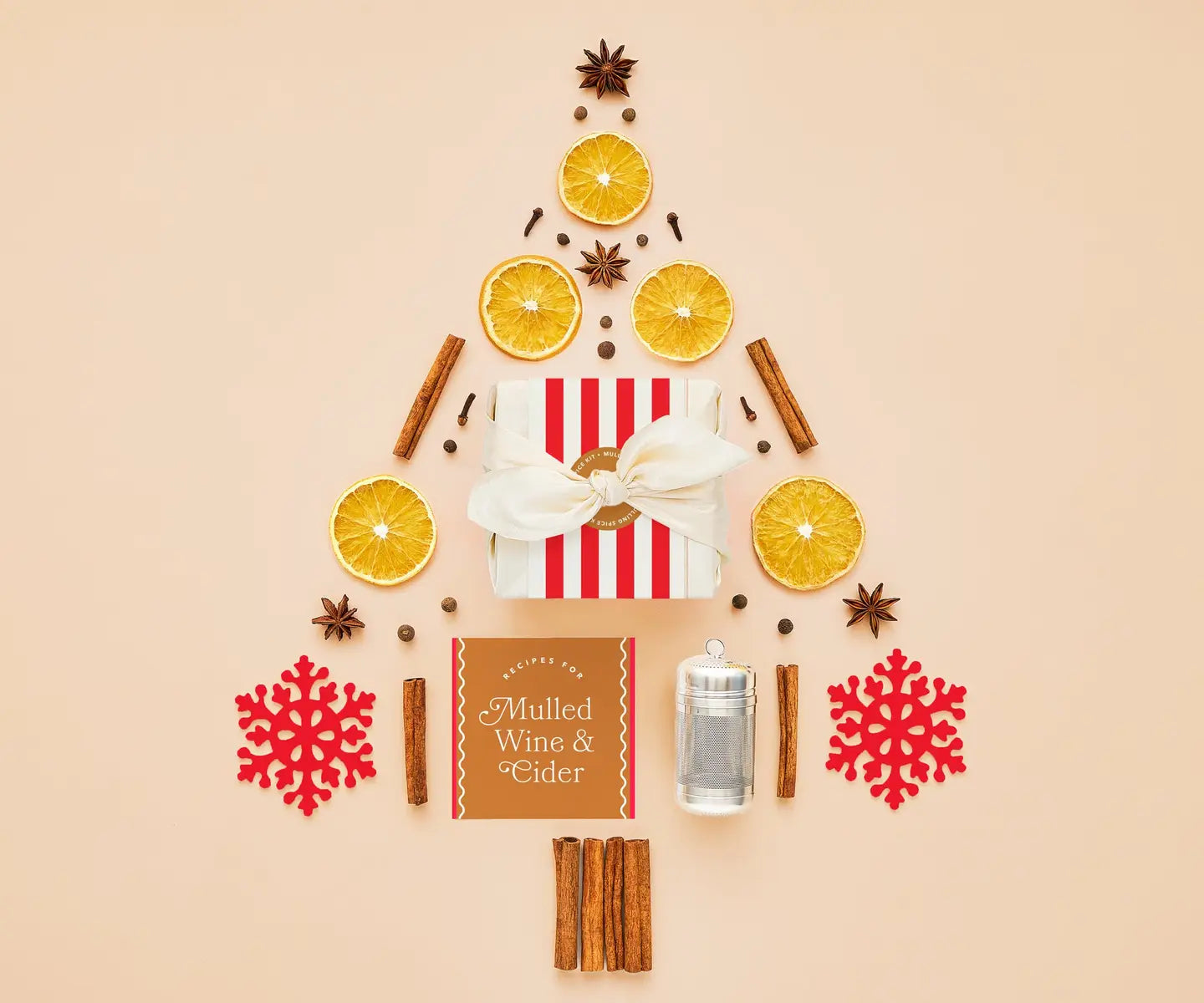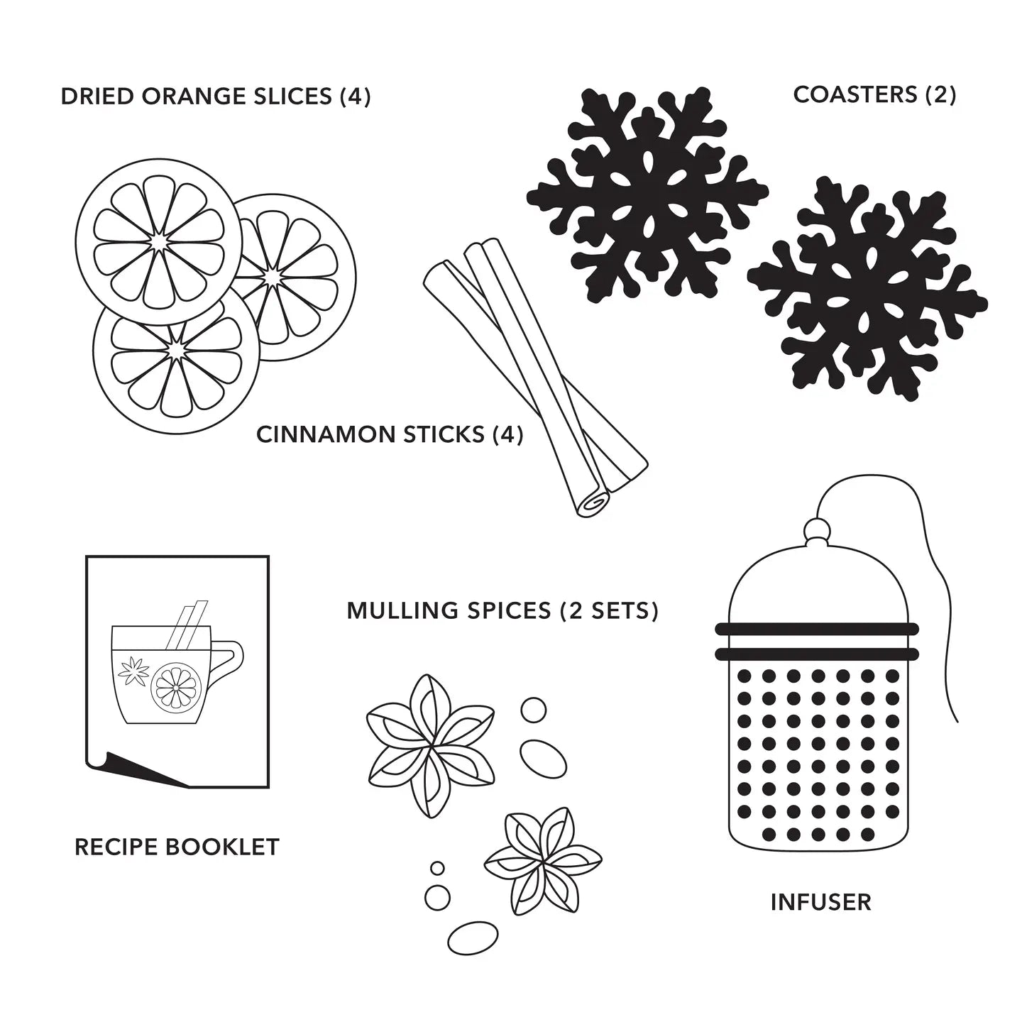 The kit's 10 essentials include: 2 large brews of mulling spices, 4 cinnamon sticks, stainless steel spice infuser, 2 red felt snowflake coasters, and a recipe card for mulled wine or cider.
