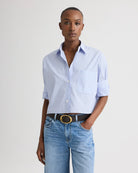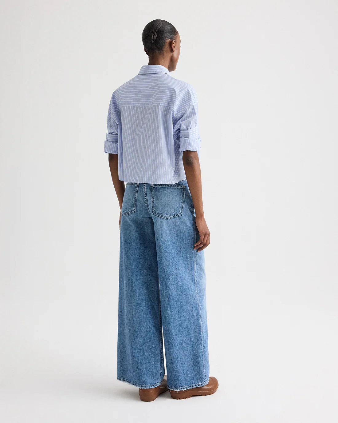 TWP’s signature short sleeved button down crafted in spaced stripe shirting. The Next Ex is a cropped, boxy silhouette, complete with a chest patch pocket, button up placket, spread collar, and our signature double roll button cuffs.