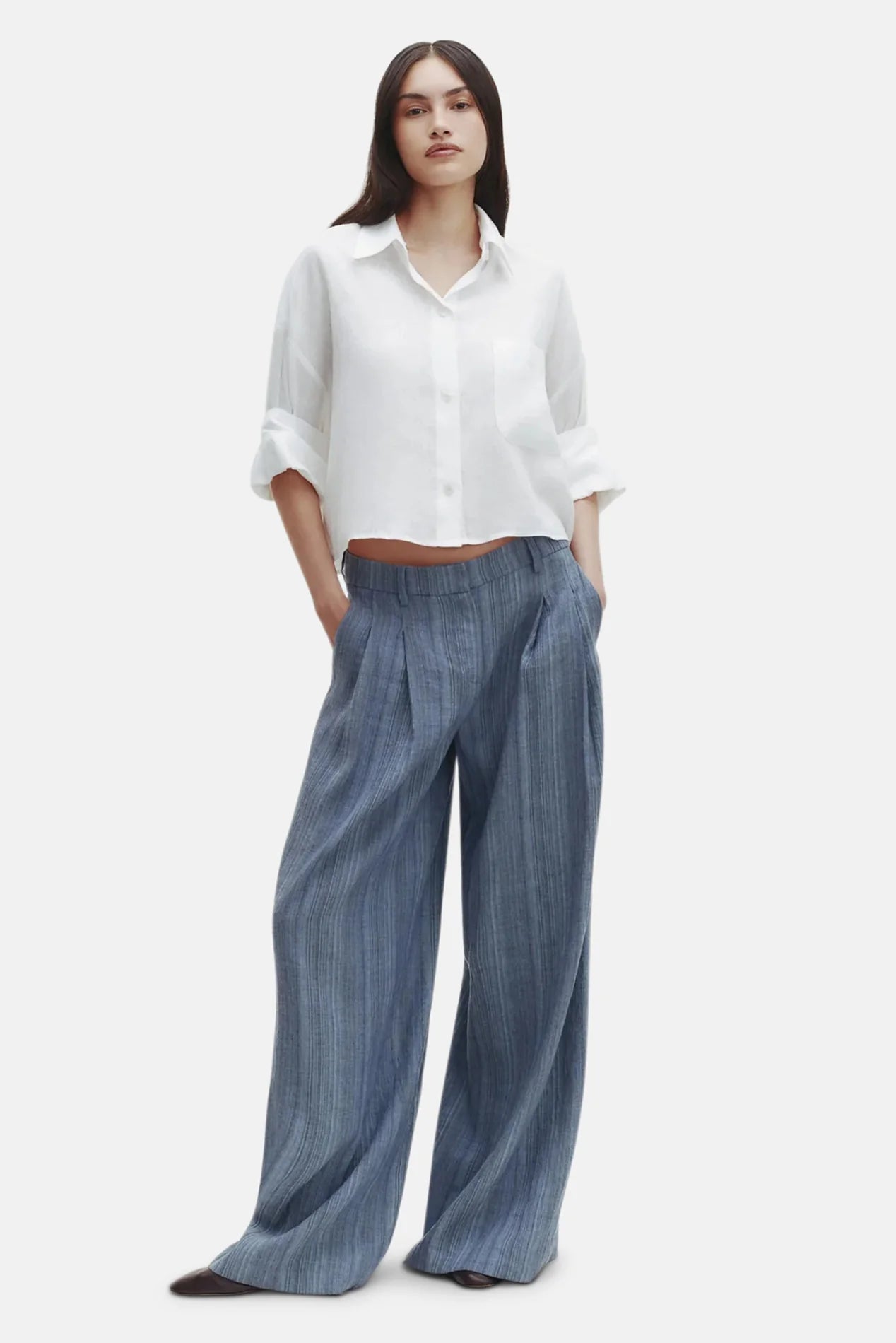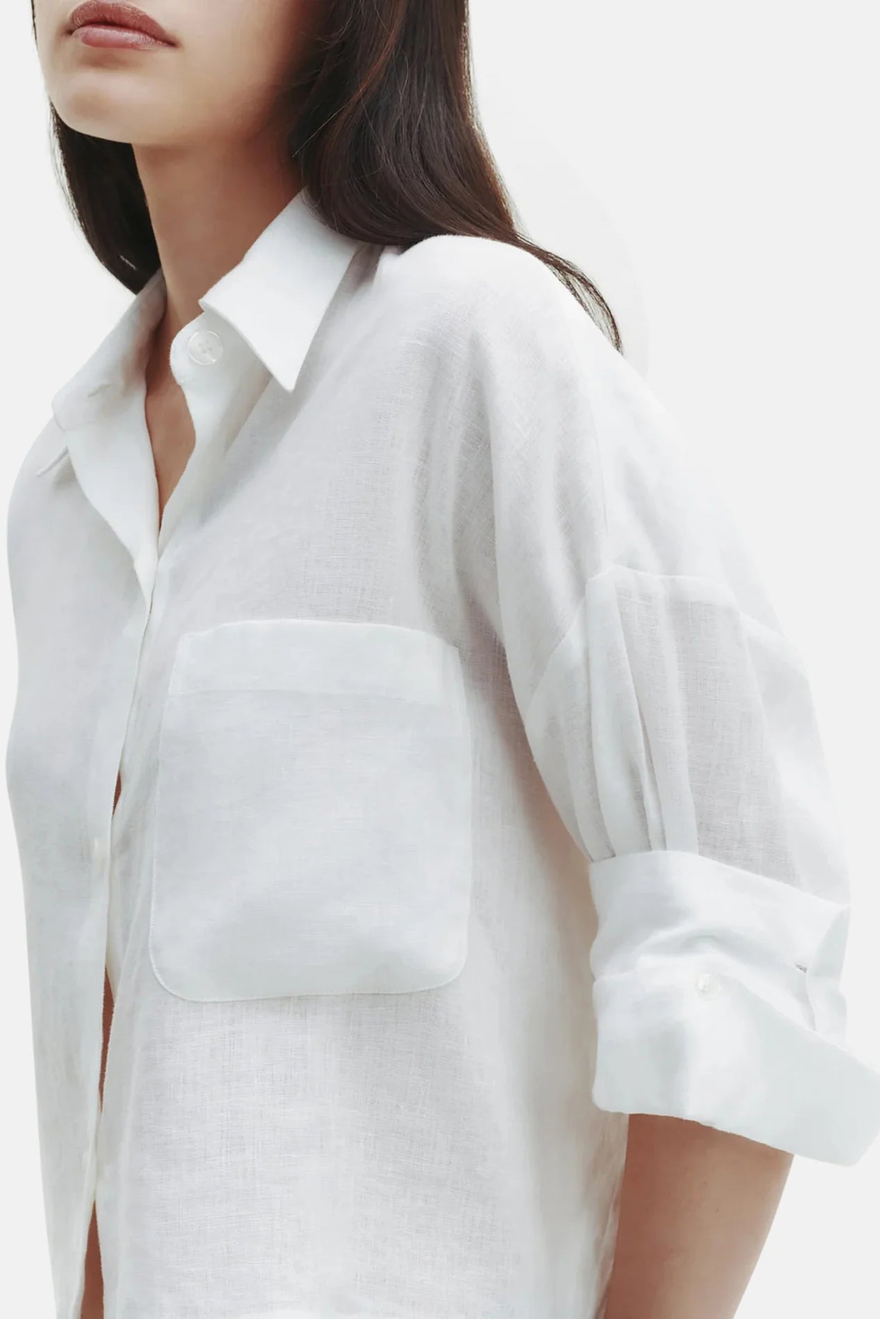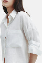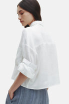 Cropped, short sleeved button down in Delave linen. This fabric is lightweight, with a soft hand and chambray effect. The Next Ex is a cropped, boxy silhouette. Complete with a chest patch pocket, button up placket, spread collar, and our signature double roll button cuffs.