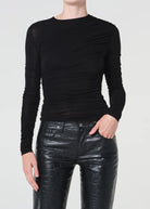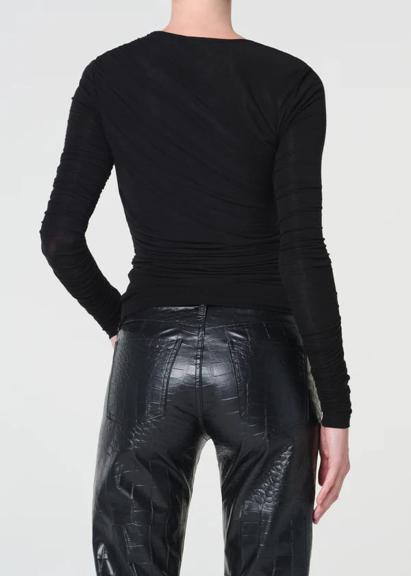 The Tania features beautifully layered diagonal rouching, highlighting texture and form. Crafted from an ultra-fine, soft-stretch fabric. this slightly-sheer top is designed with a slim fit.