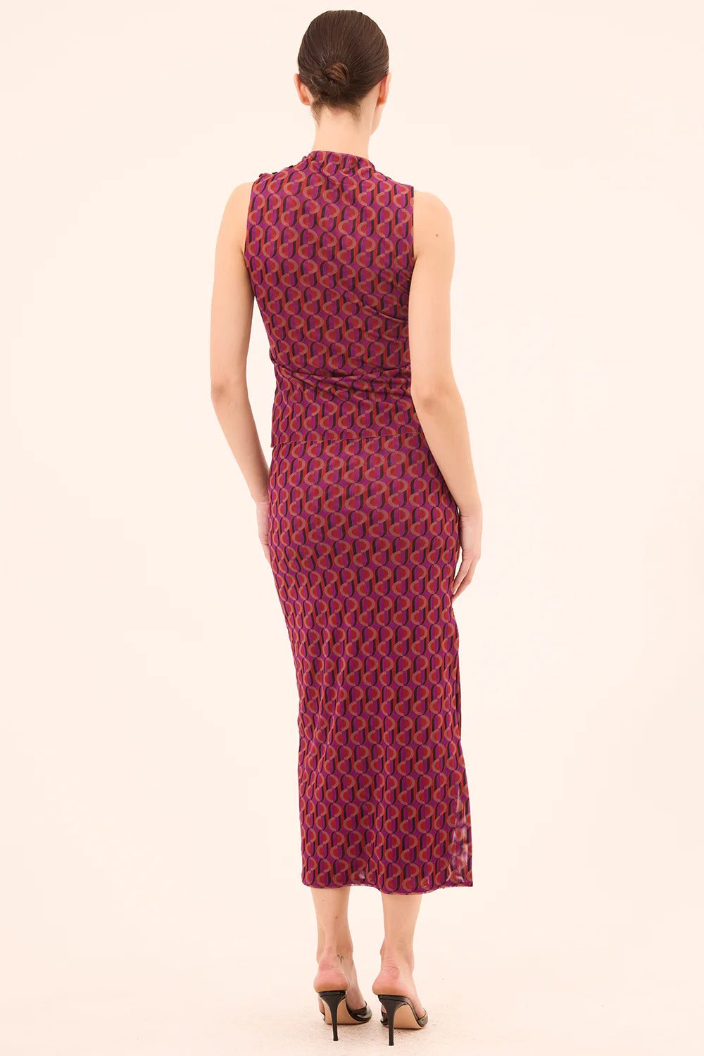 Nena is a sleek, sleeveless top cut from our graphic Geo Sixty stretch mesh. This figure-hugging silhouette features a high neckline gathered softly at one shoulder for a modern touch. Double lined with a pull-on fit. Pair with the coordinating Aisha skirt for a striking set.