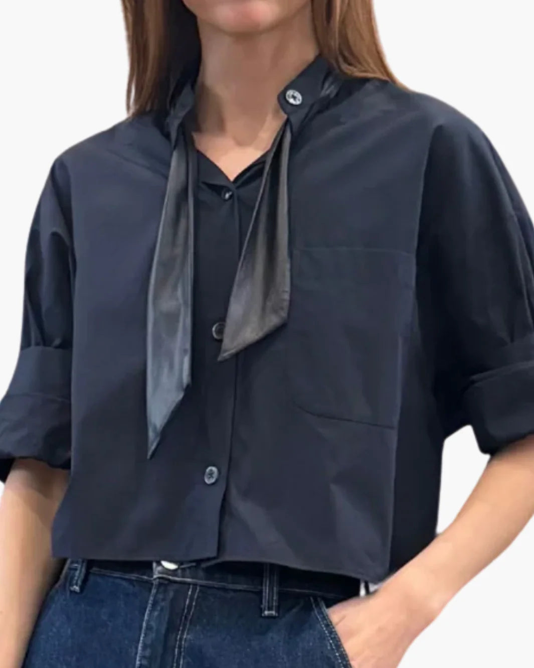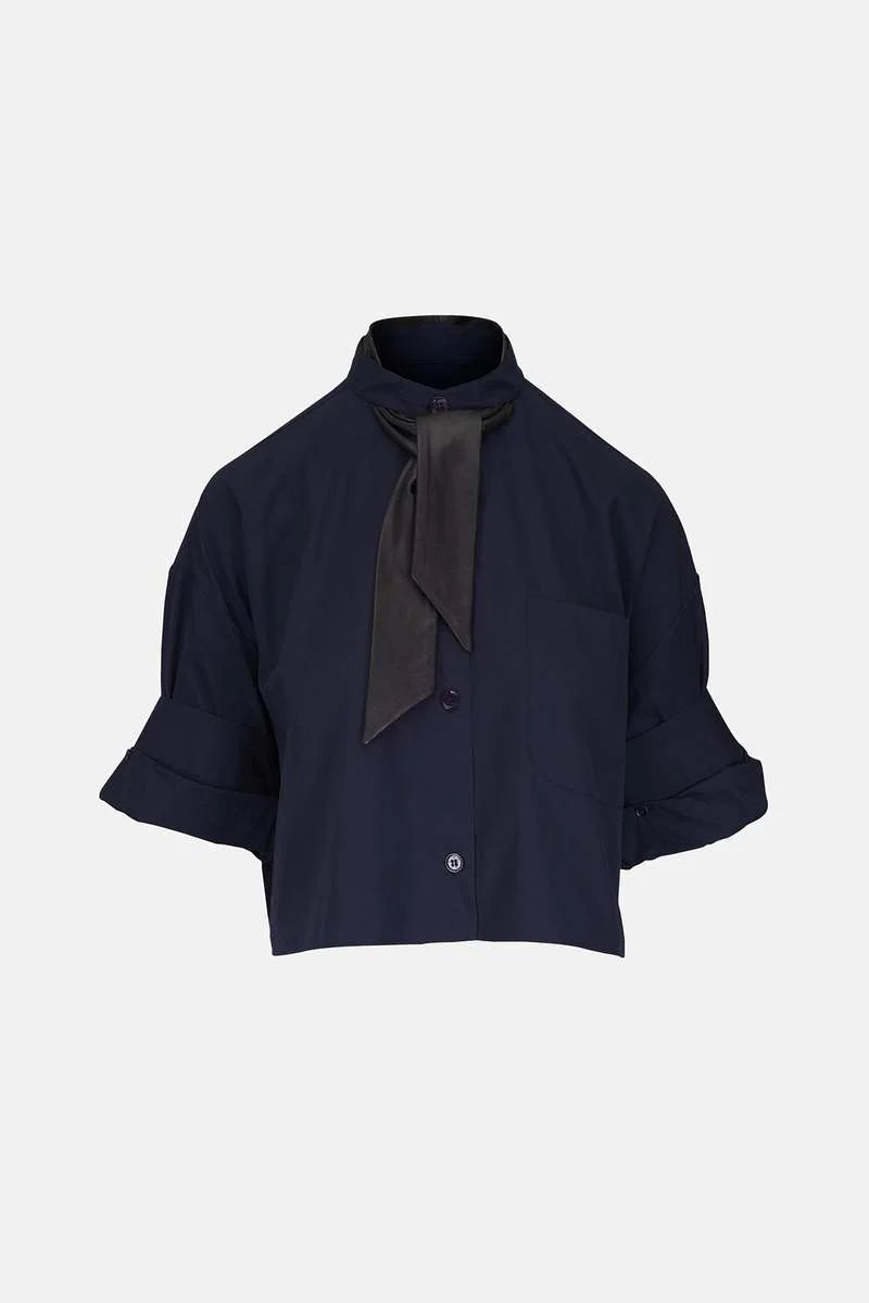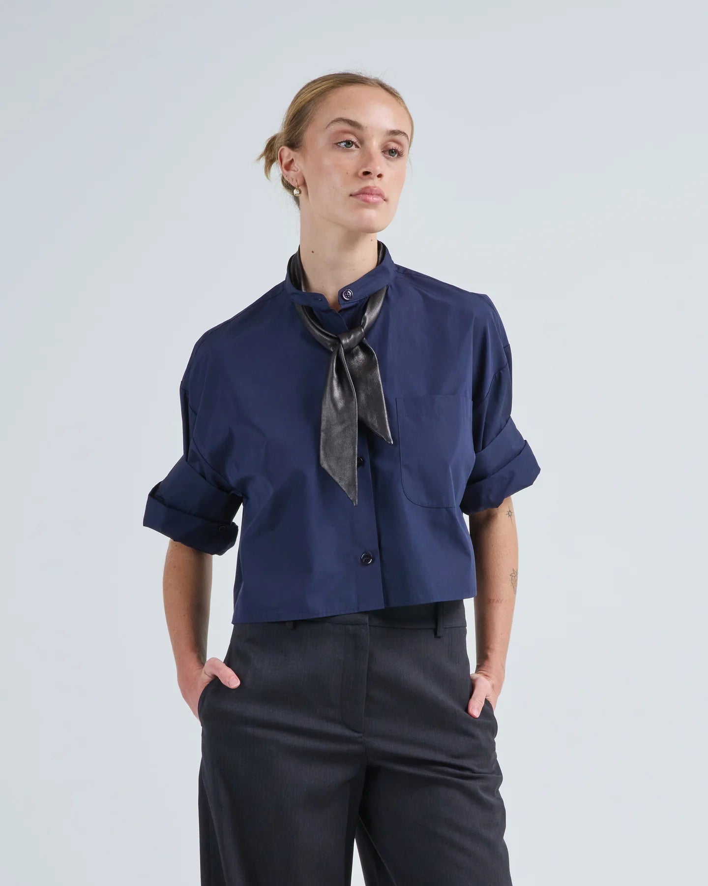 The Ex on Repeat Shirt in Midnight by TWP reimagines the button-up with a modern edge. Crafted in crisp cotton poplin with luxe lamb leather accents, it features a detachable leather tie at the band collar for versatile styling. A cropped, boxy silhouette with drop shoulders and a chest patch pocket gives this shirt an effortlessly cool feel, balanced by tailored detailing.