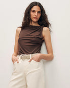 An essential, elevated. The Otessa tank top is crafted from soft stretch jersey in rich brown, designed for a relaxed fit with elegant drape. Featuring a clean boat neckline and softly twisted shoulder detail, it skims the body with an easy, fluid feel. A true foundation piece, it tucks in effortlessly to any bottom.