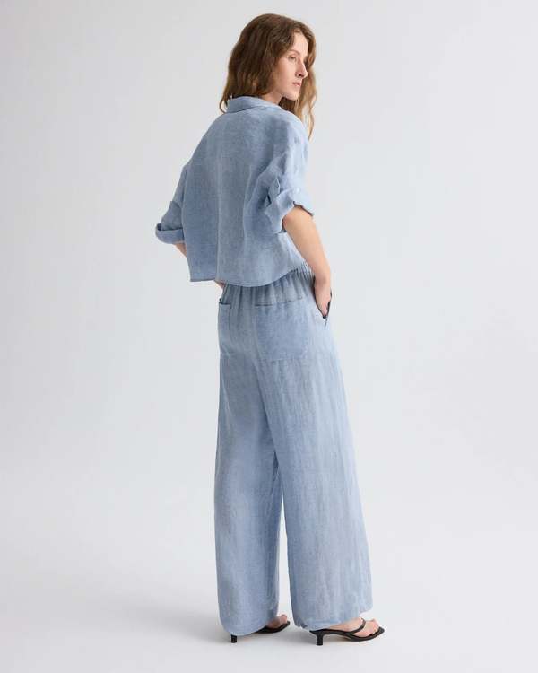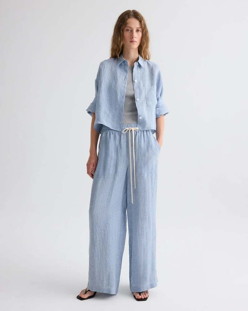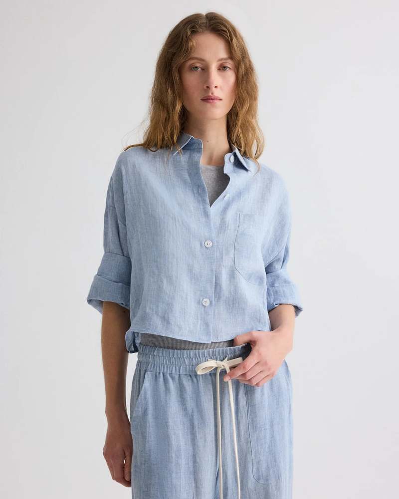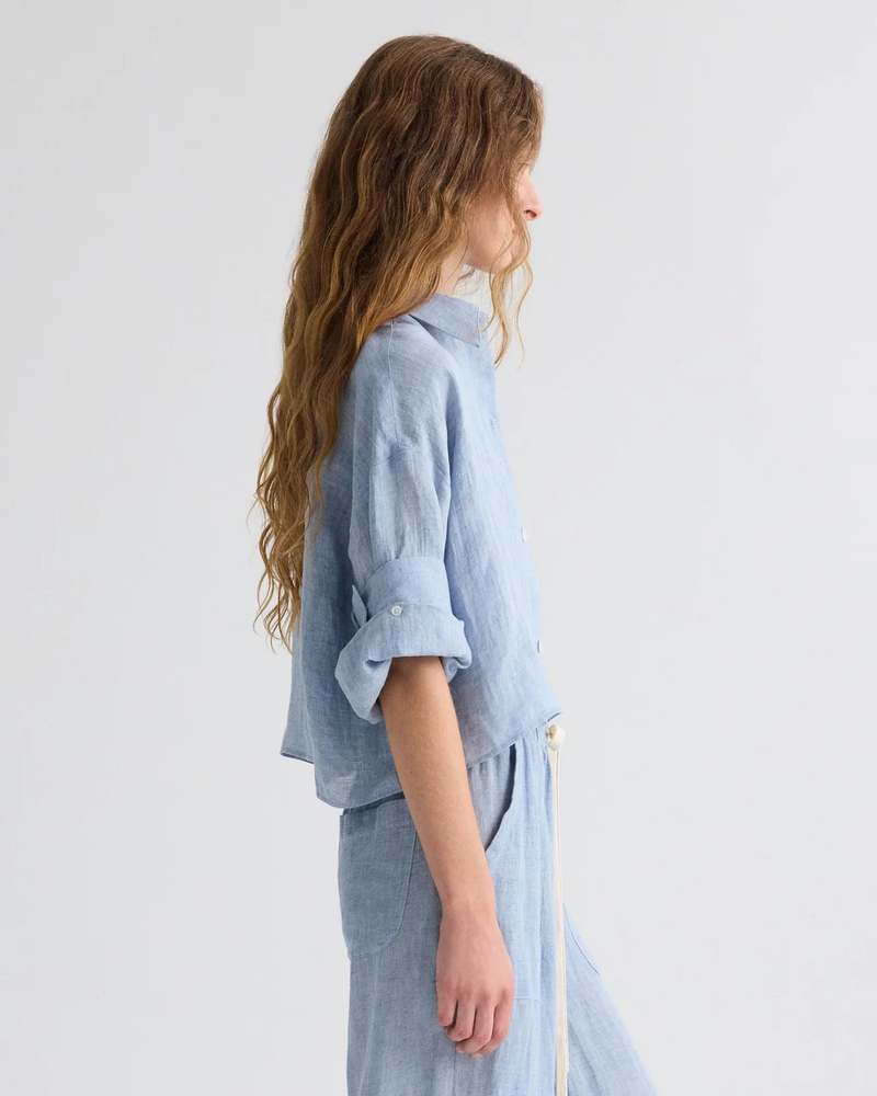 TWPs signature short-sleeved button down crafted in lightweight delave hemp. This fabric is lightweight and washed to create a distressed effect. The Next Ex is a cropped, boxy silhouette, complete with a chest patch pocket, button up placket, spread collar, and signature double roll button cuffs. Composition: 100% Hemp Color: Light Indigo