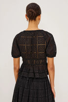 The Argenta is a cropped top in broderie anglaise eyelet cotton, featuring an elastic-trimmed V-neckline, waist, and cuffs, short raglan sleeves, and a softly flared ruffle hem.