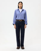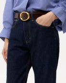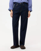 Dark-wash, high-rise, straight-leg jeans in authentic washed heavy denim. Relaxed at the hip and through the leg. Complete with five-pocket styling, custom metal rivets, zip-fly, belt loops, metal shank, and contrast stitching at the seams.