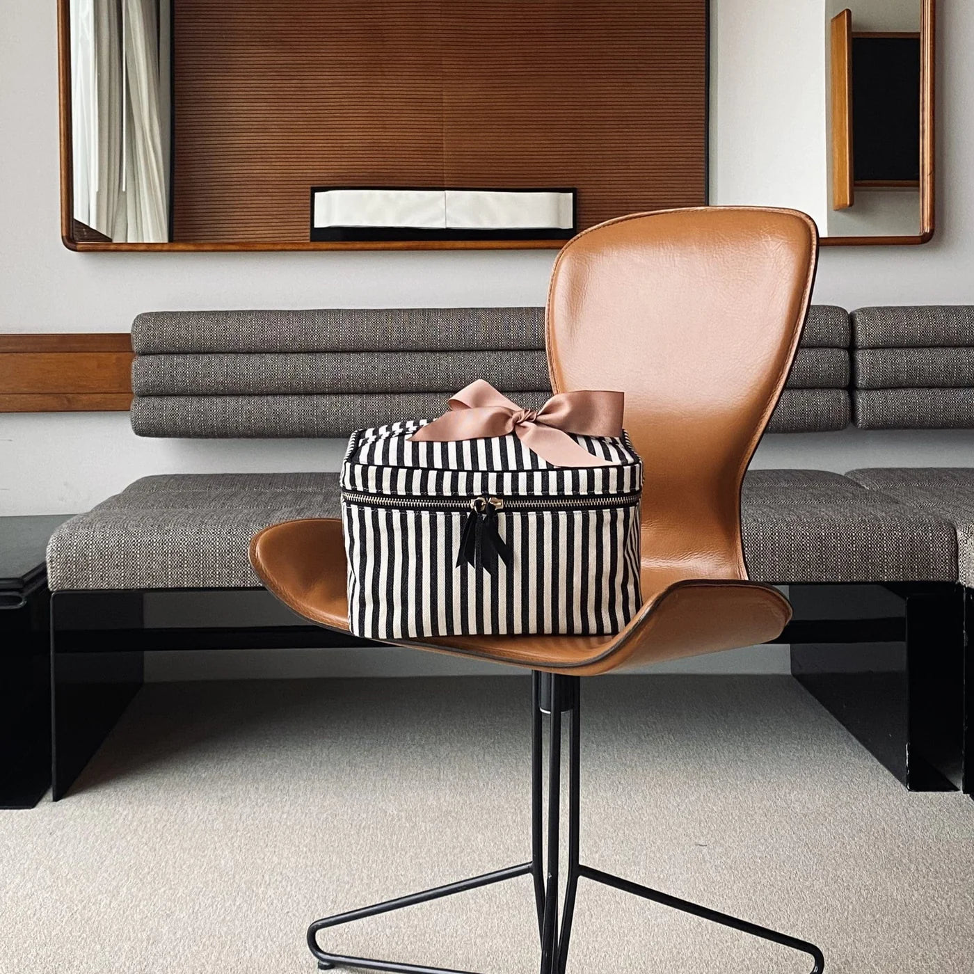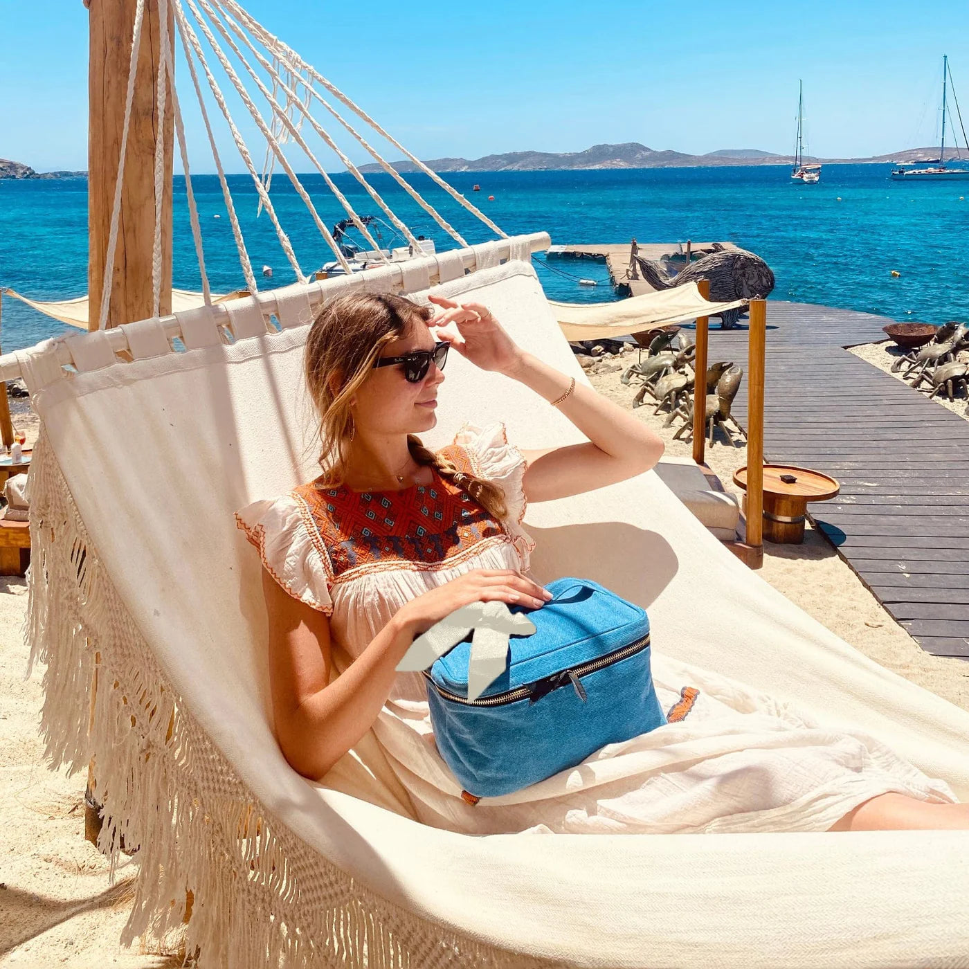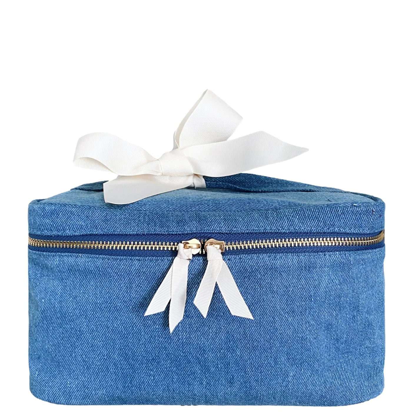 Looking for a stylish and luxurious way to keep your makeup organized at home or while travelling? Look no further than the Bag-all's Stylish Case for Travel/Home/Makeup organizing in our newest Denim! The high-quality cotton fabric and striped laminated inner lining makes sure this case will last. It is the perfect medium size, fitting all your trinkets and beauty products! This makeup case the excellent storage to organize your makeup while on the go or at home. The case comes blank, so monogram it with whatever you have inside, whether that be Medicine, Cords, Makeup, etc. The durable gold metal zipper and detachable recycled grosgrain ribbon is not only looks cute but also provides the utmost security for your things. Travel and store with ease, without ever having to worry about the mess.