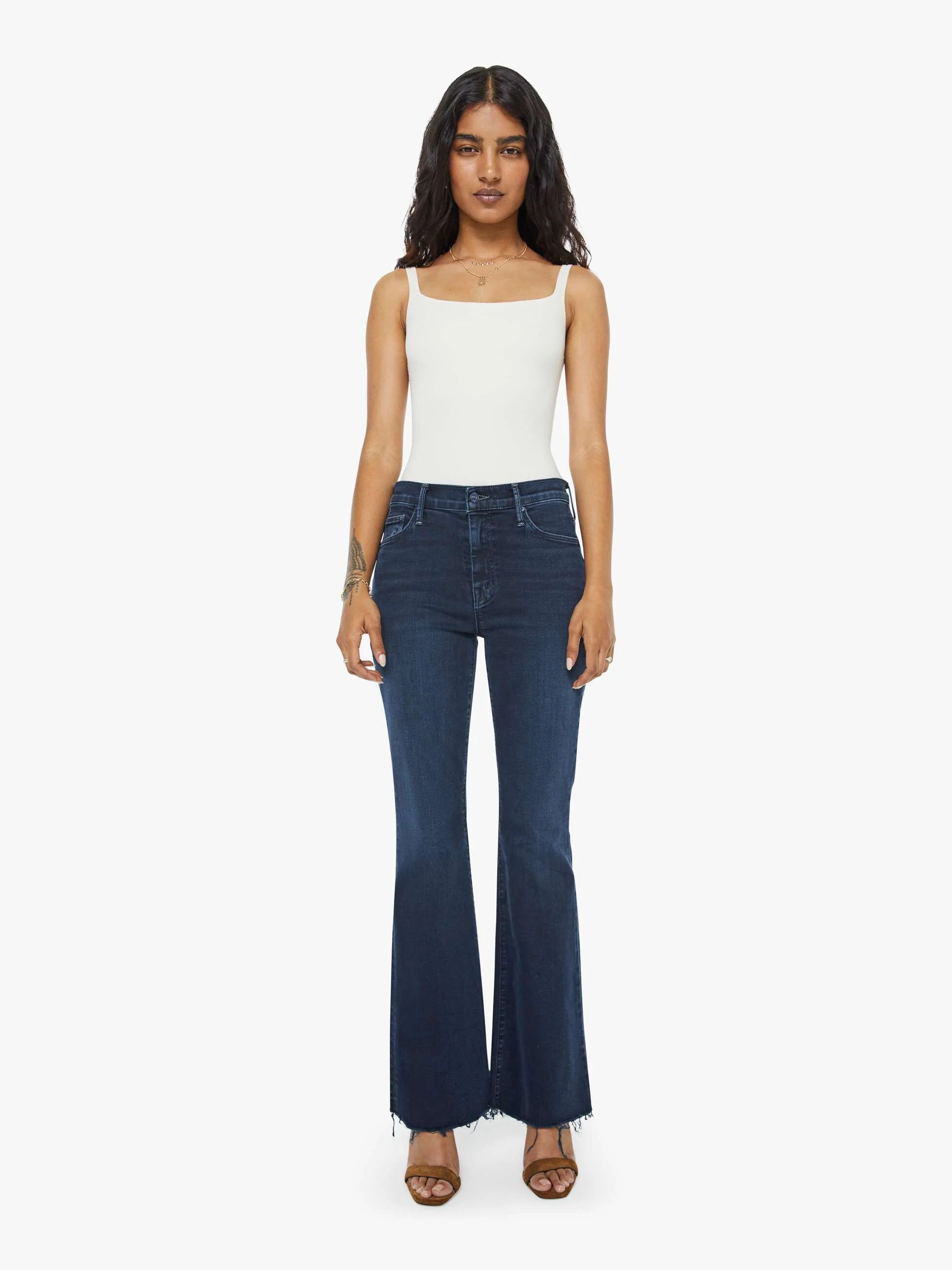 Our most popular mid-rise flare has a 29-inch inseam with a frayed hem. Cut from denim with a touch of stretch, Chip On My Shoulder is a dark blue wash with super subtle fading and whiskering.