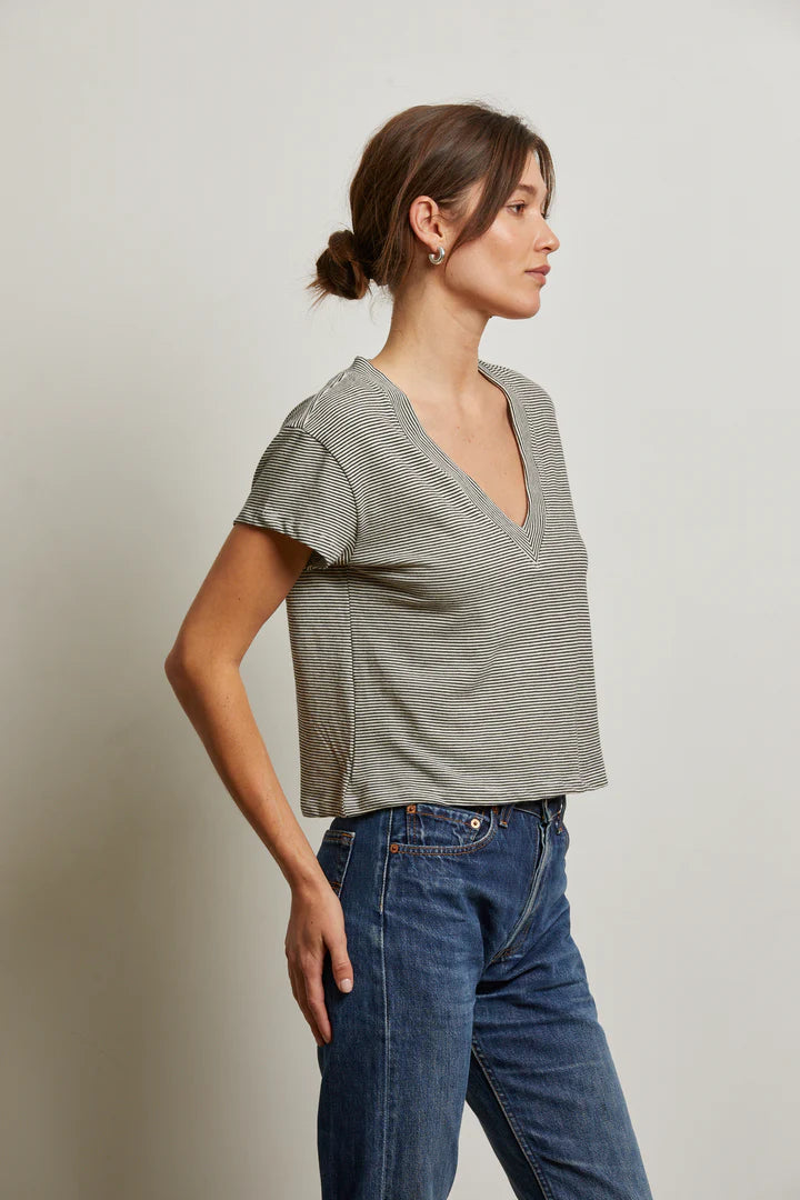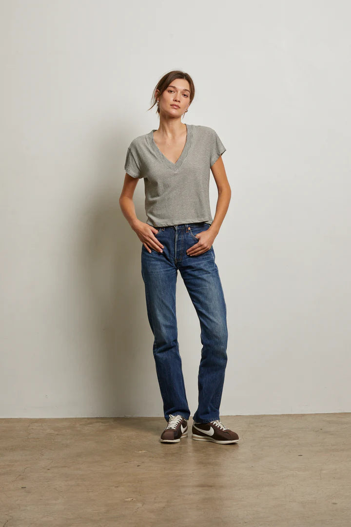 if a tee can be both ultra relaxed for day and leveled up for night, you know it’s a unicorn tee. meet rosie, the classic tee featuring a v neckline and short sleeves with a full length straight body that gently floats away from the body.