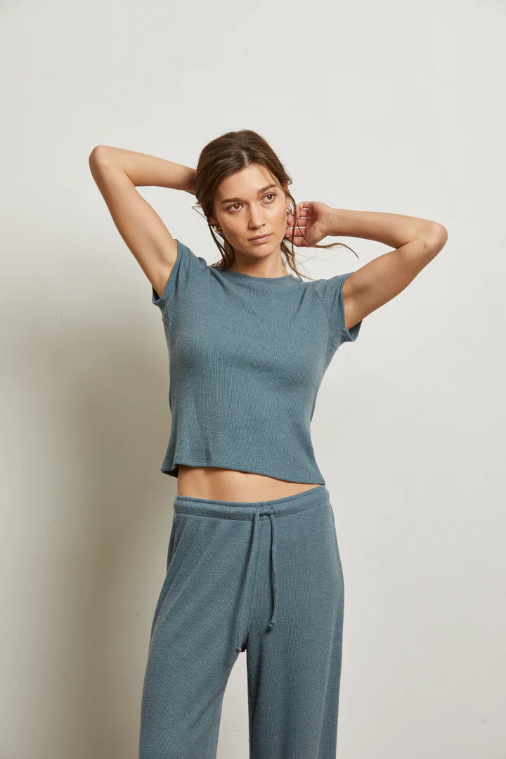the mindy top from our brushed waffle collection brings just the right mix of sweet and bold. with a capped sleeve and a hem that hits at your natural waist, she’s clean-cut without being cropped. wear her with the maddie pant for a laid-back look, or take her out with your favorite bottoms when the vibe calls for more.