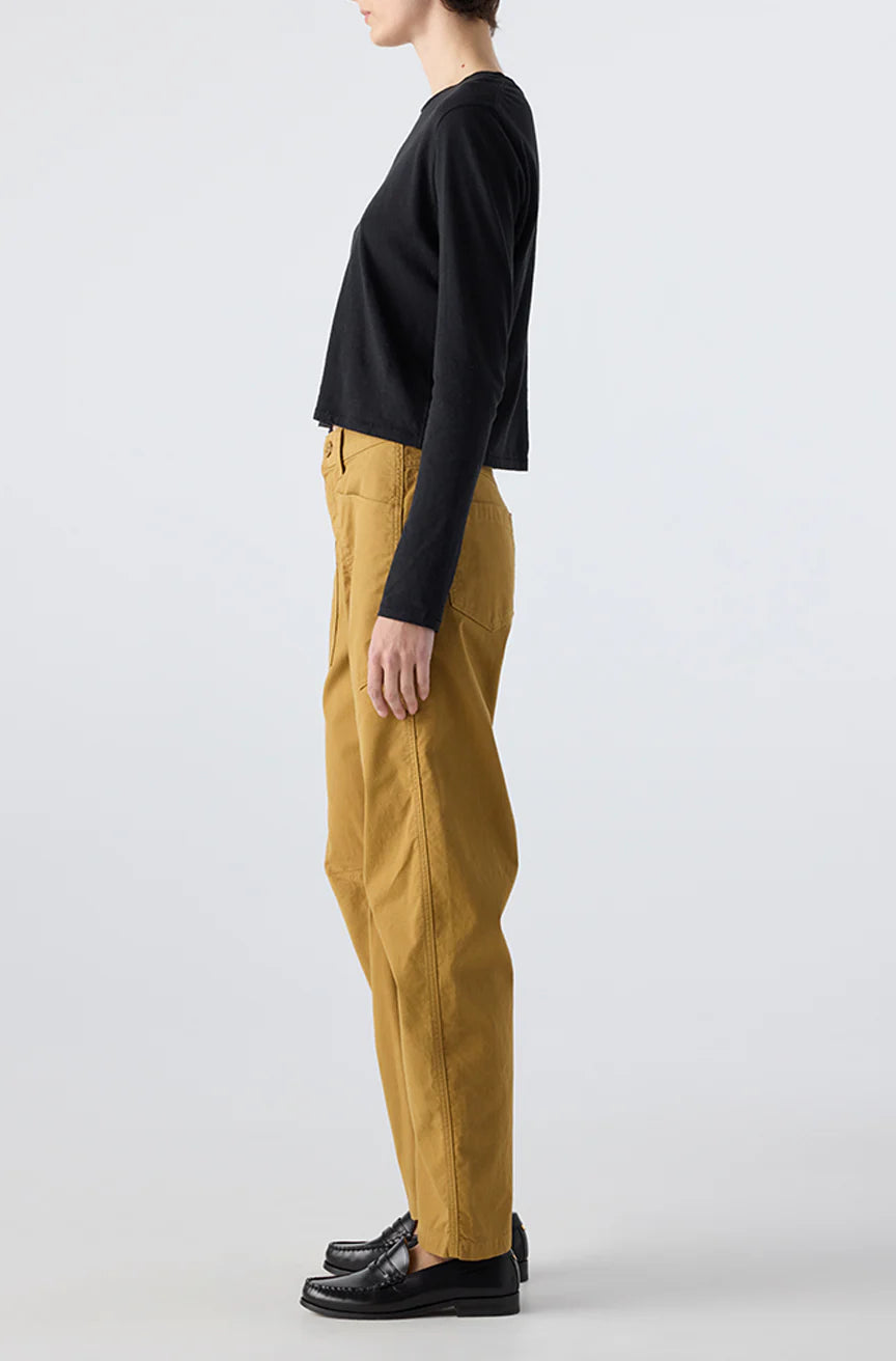 A high rise, military-inspired pant with front patch pockets. Relaxed through the hip and thigh, featuring a slight barrel shape and knee darts for added articulation. Finished with a trouser hem for a refined look. Zip fly