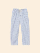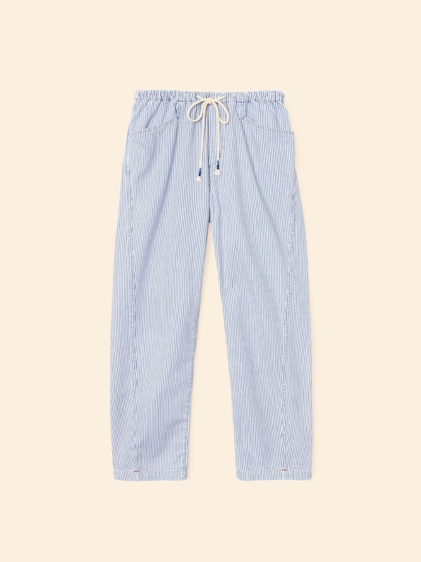 Denim Days. Baxter is updated this season in our railroad striped denim. This slightly cropped pull on pant features an elasticized drawstring waist with rope cord detail, front square pockets, flap back pockets with button closure, and a subtle barrel leg.